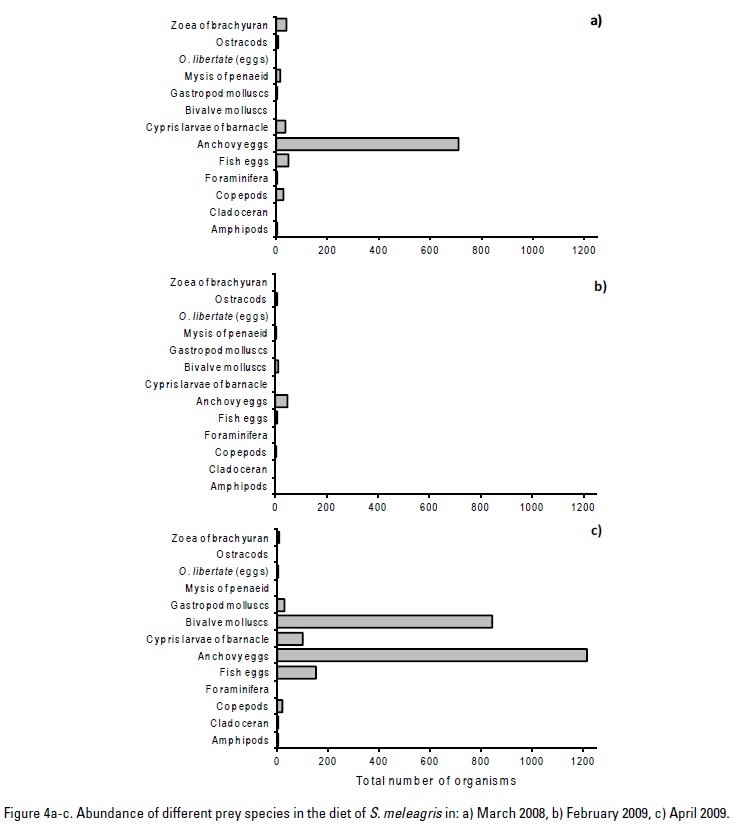 Other prey groups like amphipods, cladocerans, foraminiferans, and eggs of Opisthonema libertate (Gunther, 1867) were of low importance in terms of occurrence. They were occasional prey in S. meleagris' diet.
