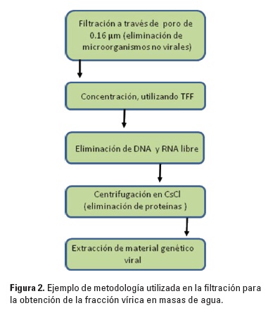 Con el objetivo de evaluar la variabilidad de la comunidad vírica en función de las condiciones ambientales, en la mayoría de los estudios de metavirómica publicados se realiza una toma de muestras distribuida tanto espacial como temporalmente (Djikeng et al., 2009; Oh et al., 2011). Este tipo de muestreo debe aplicarse en contexto con las particularidades del ecosistema objeto de estudio, como por ejemplo la zona más oxigenada o donde la actividad fotosintética sea mayor en la columna de agua. Otro de los procedimientos que sistemáticamente ha sido utilizado en la toma de muestras para estudios de metagenómica viral es el filtrado (Figura 2), y se ha demostrado que el tamaño de las partículas víricas varía en función de la época de año en la que se produzca la recolecta de las muestras (López-Bueno et al., 2009). Eso implica la necesidad de variar el tamaño de poro de los filtros utilizados en el muestreo para evaluar si existen diferencias en la abundancia de las especies, en cuanto a su tamaño, a lo largo del año. Es preciso añadir en este punto que un rasgo que tienen en común los procesos de filtrado es la necesidad de eliminar las partículas en suspensión con un prelavado, de manera que se evite que entren en el análisis ácidos nucleicos celulares. Además, también es habitual utilizar enzimas degradadoras de ácidos nucleicos, con el objetivo de evitar que se analicen ácidos nucleicos libres, en solución (Rebekah et al., 2009). Esta manera de proceder asegura que se capten únicamente los viriones. Finalmente, el proceso de aislamiento de un virus debe ser confirmado visualmente mediante microscopía electrónica (Marie et al., 1999). Como ejemplo, en el trabajo de Djikeng y colaboradores, antes de procederse al aislamiento de la fracción vírica hicieron un prelavado con filtración tangencial a 2.0 y 1.0 μm. Seguidamente, se aplicó ultracentrifugación o filtración tangencial para partículas por encima de 300.000 Da (Djikeng et al., 2009). Otros trabajos hacen un filtrado preliminar de la muestra con papel Wattman de 1.6 μm de tamaño de poro y posteriormente aplican una filtración tangencial con un tamaño de poro de 0.22 μm, aplicando presión con una bomba peristáltica.