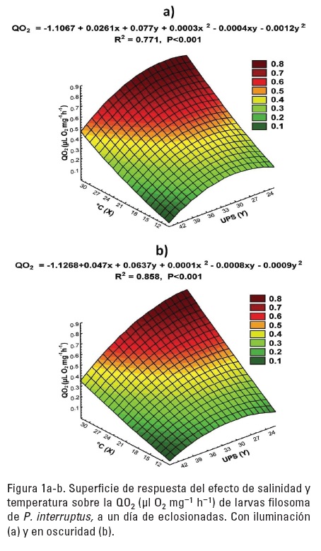 A partir de estas ecuaciones se graficaron las superficies de respuesta de la figura 1. Los valores de QO2 de la superficie de respuesta en condición de iluminación, fueron significativamente mayores (p < 0.001) respecto a los de oscuridad (Tabla 1). 3) Las larvas aumentaron de manera significativa (p < 0.001) su QO2 conforme aumentó la temperatura. Solo entre 22 y 27 °C no existió diferencia significativa (p > 0.05). El efecto de la temperatura predominó sobre el efecto de los cambios de salinidad y de las condiciones de iluminación y oscuridad. 4) Al aumentar la salinidad de 33.5 a 42 ups, la QO2 de las larvas disminuyó de manera significativa (p < 0.001) entre 0.1 y 0. 3 µl O2 mg-1 h-1. Este patrón se observó en todas las temperaturas, tanto con iluminación como en oscuridad. Al disminuir la salinidad de 33.5 a 28 ups, no hubo un efecto significativo (p = 0.728) ya que el QO2 aumentó alrededor de 1 µl O2 mg-1 h-1. Al disminuir de 33.5 a 23 ups sí hubo diferencia significativa (p < 0.001). 5) La QO2 de las larvas en 31 °C y salinidad es de 23 y 28 ups, respecto al valor en condiciones de eclosión, fue mayor en 1.56% en iluminación, y 1.71% en oscuridad. Lo contrario se presentó en 42 ups, con un QO2 68% y 56% menor en iluminación y oscuridad respectivamente. La QO2 fue significativamente menor (p < 0.001) en salinidades de 23 y 42 ups en todas las temperaturas del experimento, a excepción de la combinación 22 °C y 42 ups (p = 0.145).