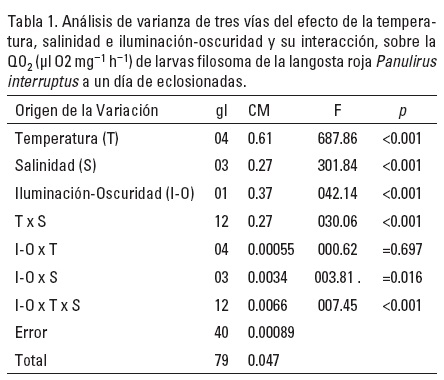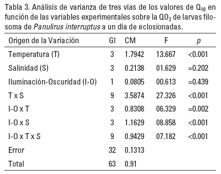 El resultado de las pruebas de normalidad y homogeneidad de varianza, de los datos de QO2 y Q10, fue que se cumplieron los supuestos. La prueba ANDEVA de tres vías (Tabla 1), mostró que los tres factores (temperatura, salinidad e iluminación-oscuridad), tuvieron un efecto altamente significativo (p < 0.001) en todos los casos. También hubo efectos significativos de las interacciones entre temperatura y salinidad (p < 0.001), entre salinidad e iluminación-oscuridad (p = 0.016), y entre los tres factores (p < 0.001). Por el contrario la interacción entre temperatura e iluminación-oscuridad fue no significativa (p=0.697).