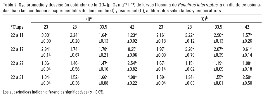 La QO2 de las larvas de P. interruptus ante cambios de temperatura, siguió un patrón similar al encontrado en otras larvas filosoma (Bermudes & Ritar, 2004; Matsuda & Yamakawa, 1997; Ikeda et al., 2011), con rangos de tolerancia y resistencia específicos y capacidad de adaptación climática (Hoar, 1978). En particular, las larvas de P. interruptus evidenciaron no compensación fisiológica en el rango de las temperaturas estudiadas de 11 a 31 °C, con una variación de la QO2 de 0.12 a 0.82 (µl O2 mg-1 h-1) y Q10 = 2.6. Este valor de Q10 fue similar al encontrado por Varó et al. (1993) en larvas tempranas de Artemia, que fue de 2.02 ante una variación de 5 a 35 °C.