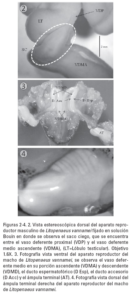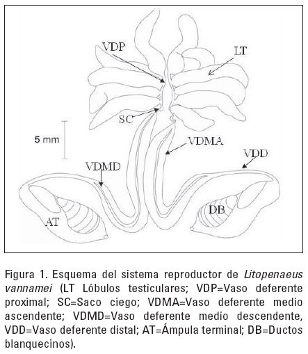 En Litopenaeus vannamei, de acuerdo con Chow et al., (1991b) y Garza-Torres et al. (2009), cada par de testículos posee ocho lóbulos unidos por el vaso deferente proximal. Los vasos deferentes medios están divididos en dos secciones, ascendente y descendente y, en su interior se encuentran dos ductos que corren paralelamente, el ducto accesorio y el ducto espermatofórico. El vaso deferente distal es el más delgado y por él pasa de forma discontinua el material proveniente del vaso deferente medio (Chow et al., 1991a). El ámpula de L. vannamei posee internamente cuatro cámaras interconectadas. En las cámaras I y II desembocan los ductos espermatofórico y accesorio, respectivamente; en ellas se deposita la masa espermática rodeada por las primeras capas que forman el espermatóforo. En la cámara III aparecen los ductos blanquecinos que son característicos de esta especie. En esta capa se forma el material glutinoso que sirve para que el espermatóforo se adhiera a la hembra. Por último, la cámara IV es un largo espacio interno que va desde la región proximal hasta la región media del ámpula terminal, interconectada con la cámara II a través de una abertura estrecha (Chow et al., 1991a).