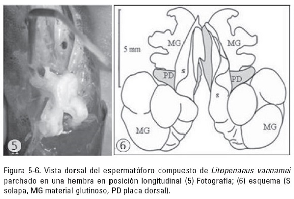 Para Litopenaeus vannamei, la placa dorsal es la más larga de las cinco especies descritas por Pérez-Farfante (1975). En nuestro trabajo observamos que esta placa se secciona a la altura de la parte media del espermatóforo. Esta división permite que cada saco espermático del espermatóforo se doble ligeramente hacia la porción ventral de la hembra, una vez que el macho lo deposita sobre el télico. En cada saco espermático se observó que la mayor concentración de espermatozoides se encuentra en la región distal y que esta masa espermática está rodeada por una segunda capa, que King (1948) denominó sustancia gelatinosa. Adicionalmente, esta masa está rodeada por una pared de material glutinoso, distribuido principalmente a lo largo de la parte proximal media de cada saco.