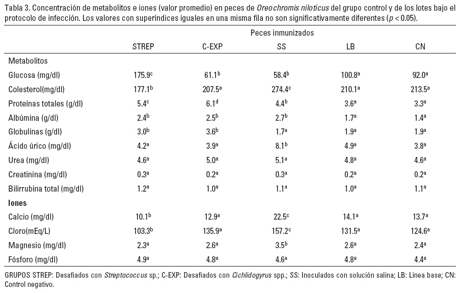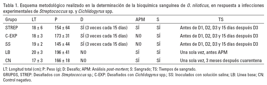 El objetivo de este estudio fue analizar la bioquímica sanguínea de tilapias infectadas individualmente con extractos antigénicos de Streptococcus sp. y Cichlidogyrus spp. para conocer las variaciones específicas del hospedero en respuesta a la infección de cada patógeno. Estos cambios podrían ser de utilidad para los acuacultores que monitorean sus estanques en la búsqueda de patógenos en etapas sub clínicas y antes de desencadenarse mortandades difíciles de controlar. Para lograr parámetros de comparación confiables y establecer las variaciones correspondientes, se contó con datos de tilapias O. niloticus, libres de infección y en condiciones habituales de cultivo (línea base) para contrastarlos con los peces sometidos a las infecciones provocadas (Silveira-Coffigny et al., 2004). Asimismo, con el objetivo de aumentar la reproducibilidad del análisis, se implementó la técnica de microplaca de 96 pocillos como soporte físico y un lector análogo de densidades ópticas para la valoración de los sueros.