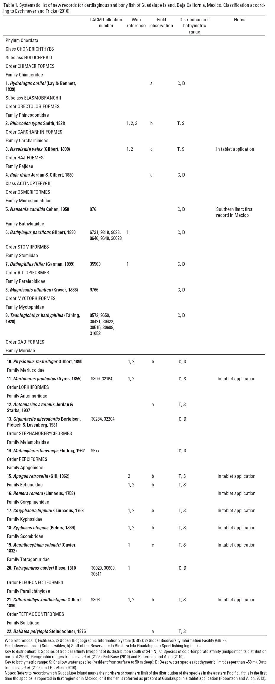 Most fishes in Table 1 are small (less than 20 cm in total length) or hard to observe or catch as they live in deep or open waters (Love et al., 2005); therefore, this is the first paper to properly address their presence at Guadalupe. However it is rather surprising that the formal literature has overlooked the presence of species that have been observed repeatedly in the area and which are of touristic and fishing importance, such as the whale shark Rhincodon typus Smith, 1828, the whitenose shark Nasolamia velox(Gilbert, 1898), the hake Merlucciusproductus (Ayres, 1855) and the dolphinfish Coryphaena hippurus Linnaeus, 1758. This situation calls for a more thorough study of the marine communities of this isolated island in order to have a full checklist of the local ichtyofauna. Finally, it is worthwhile to note that eight of the new records included here are confirmed in a non-refereed tablet application authored by two specialists (Robertson & Allen, 2012; Table 1); unfortunately the program did not specify the origin of the records, but nevertheless that source supports the results presented here.