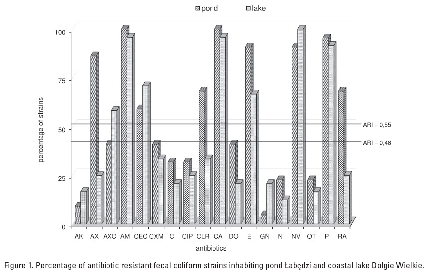 Bacteria occurring in many water basins show multiple antibiotic resistance (MAR) as it was reported by Qureshi and Quershi (1992), Mary et al. (2000), Miranda and Zemelman (2002), Mudryk and Skórczewski (2009). According to Meirelles-Pereira et al., (2002) multiple resistance may be coded on plasmids, mutational events or on even smaller and mobile genetic elements called transposons. The present study also showed multiple antibiotic resistance of fecal coliform bacterial strains inhabiting both studied water basins. The majority of enteric bacteria in the pond was resistant to 11-12 antibiotics and in the lake 6-7 antibiotics of 18 antibiotics used in this study. That means that coliforms are perfectly capable of detoxicatingthose pharmaceutical organic compounds. The calculated MAR values were higher than those reported by Miranda and Zemelman (2002). Adaptive responses of bacterial communities to several antibiotics observed in the present study may have possible implications for the public health (Qureshi & Quershi, 1992) and may reflect the history of antibiotic application.