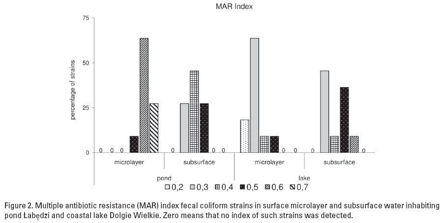 The collection of fecal coliform bacteria isolated from the surface microlayer and the subsurface water of both studied water basins was analyzed for multiple antibiotic resistance (MAR) index (Fig. 2). It is of great interest that the MAR index for fecal coliform bacteria isolated from the polluted pond was higher than the index proven among enteric bacteria inhabiting the non-polluted lake. It has been determined that above 60% of fecal coliform bacteria isolated from the microlayer of the pond showed a 0.6 MAR (i.e. resistance to 11-12 of the 18 antibiotics tested) and 45% of fecal coliform bacteria inhabiting the subsurface water showed resistance to eight antibiotics (MAR = 0.4). In lake Dotgie Wielkie the higher percentage (45-63%) of bacterial fecal coliform strains isolated from the surface microlayer and subsurface water show a 0.3 MAR (resistance to 6-7 of the 18 antibiotics tested).