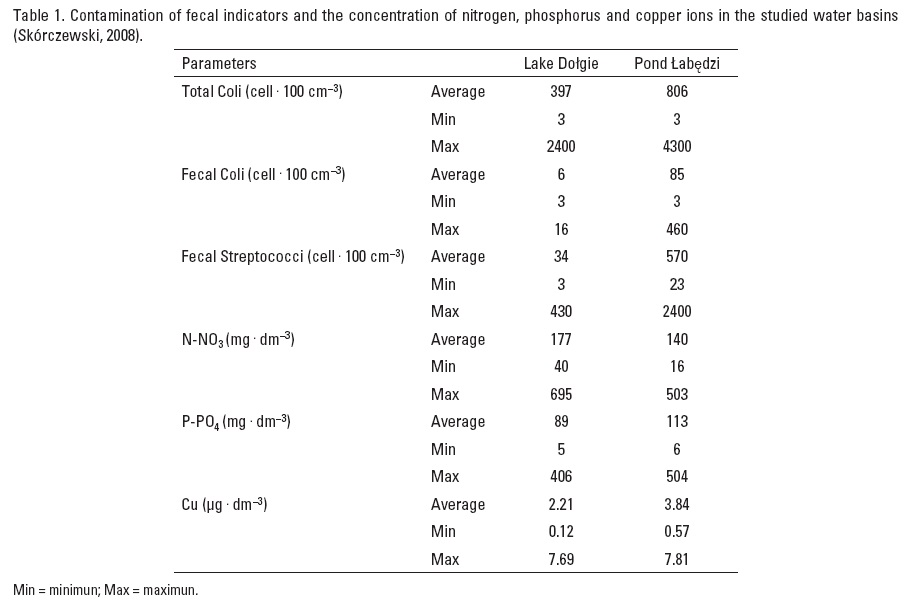 The study was carried out in two water basins that are characterized by various level of anthropogenic impact on the environment; the downtown pond Łabędzi and the coastal lake Dolgie Wielkie. The pond Łabędzi was situated in the centre of a city occupied with 100,000 inhabitants. The surface is about 1.5 ha and the average depth is about 2 meters. The studied pond is connected by a channel with the polluted Słupia river which large amounts of river water abundantly penetrate into the pond. As a result, the studied pond is characterized by high levels of pollution (Table 1). The pond is dominated by fecal type pollution and all other pollution that is washed out from the streets and that flows into the pond along with pollution from storm drainage