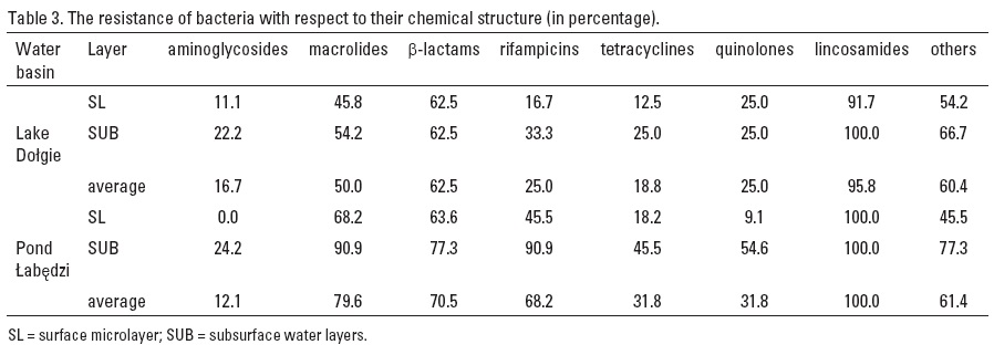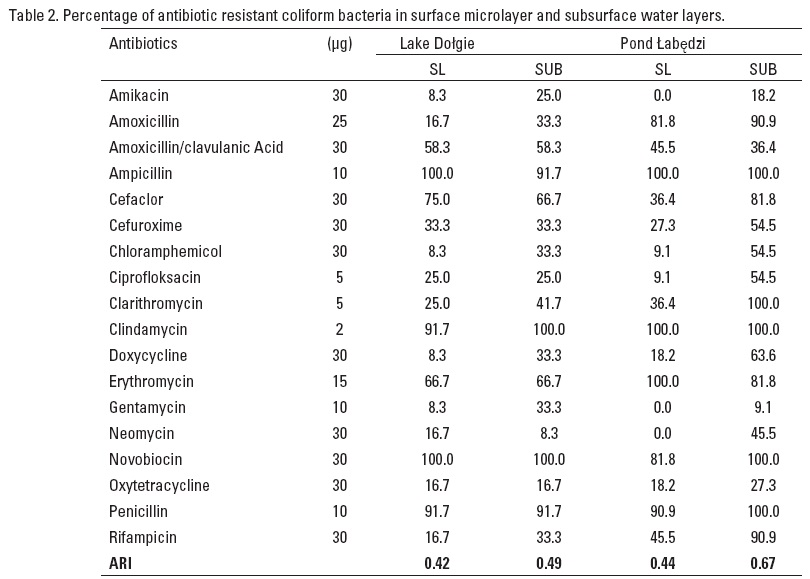 Due to this fact, surface membrane is thought to mediate in the matter and energy exchange processes occurring between the water basin and atmosphere. The surface membrane also constitutes a specific buffer zone for anthropogenic pollution from the atmosphere i.e. pesticides, hydrocarbons, heavy metal compounds, etc. (Maki & Herwig, 1991). In the surface membrane the accumulation of Coli bacteria is observed (Skórczewski & Mudryk, 2009) originating from the sewage and brought with bioaerosol from the land. The bacteria constitute the specific type of antibiotic resistant genes that are spread in aquatic environment. Thus, the aim of the research was to compare antibiotic resistance of fecal bacteria occupying the surface microlayer and the subsurface layer of two water basins differing in the level of pollution.