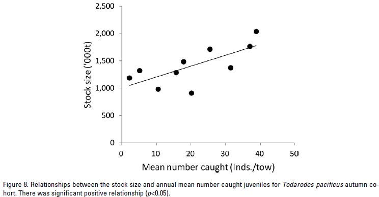 The mean numbers of the autumn cohort in the trawl surveys were used as an index of the annual abundance of juveniles, which was used as explanatory variables to predict the stock size of the autumn cohort. These data were fit to a simple linear model (Y= ax+b) by the least-square method, and the significance was tested based on the null hypothesis (a=0).