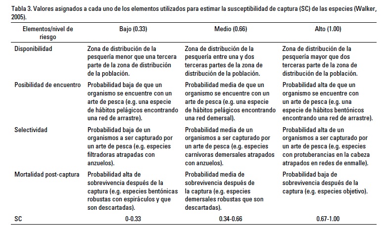 Aunque cada elemento que conforma la SC puede ser estimado matemáticamente, para efectos de una evaluación rápida se asignaron valores probables (bajo = 0.33, medio = 0.66 o alto = 1) de acuerdo a la escala propuesta por Walker (2005) (Tabla 3). Esta escala considera la distribución reportada de las especies, el radio de operación de la pesquería, la profundidad a la que se encuentran las especies, sus hábitos, biología, características de los sistemas de captura utilizados en la región para la pesca de tiburón y si estas son especies objetivo.