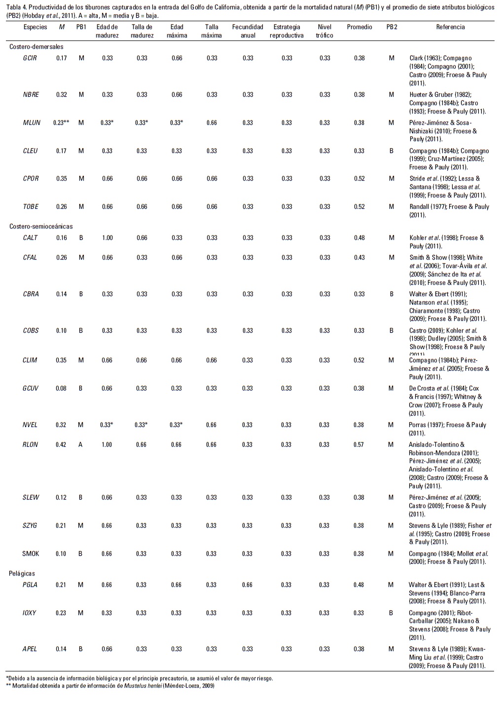 Así mismo, la PB estimada para algunas especies en el presente estudio, coincide con el "potencial de recuperación" (r2M) estimado por Smith et al. (1998) con base en algunas características de historia de vida. Por ejemplo, se han estimado PB y r2M bajos en especies costero-demersales y semioceánicas de talla media-grande como Carcharhinus obscurus, C. leucas y Sphyrna lewini, las cuales tienen crecimiento lento y maduración tardía (Natanson et al., 1995; Cruz-Martínez et al., 2004; Anislado-Tolentino et al., 2008; Smith et al., 1998); PB y r2M medios en especies pelágicas de talla grande (>250 cm de longitud total) como Prionace glauca e Isurus oxyrinchus y costero-semioceánicas como Carcharhinus falciformis, consideradas de crecimiento relativamente rápido y maduración temprana (Smith et al., 1998; Ribot-Carballar, 2005; Sánchez de Ita et al., 2010).