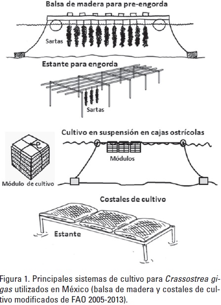 Por otro lado, una de las problemáticas con C. gigas en México es el escaso desarrollo tecnológico en los sistemas de cultivo. Aunque se han utilizado una variedad de estructuras como linternas, cajas plásticas para frutas, costales cebolleros, bastidores de madera cubiertos con malla mosquitero, etc., los sistemas más utilizados se restringen principalmente a tres diferentes tipos; balsas y estantes, cajas ostrícolas y costales. Estos sistemas se han utilizado desde la introducción de la especie y no han sufrido grandes variaciones a lo largo del tiempo.