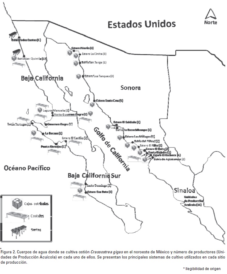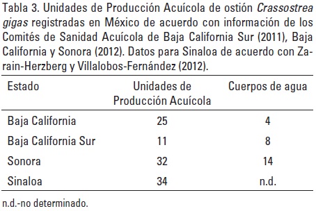 La producción de C. gigas en México se concentra principalmente en la costa del Pacífico de los estados de Baja California y Baja California Sur y dentro del Golfo de California en las costas de Sonora (Fig. 2). Además, el cultivo de la especie se ha venido desarrollando de manera importante en Sinaloa (Zarain-Herzberg & Villalobos-Fernández, 2012), y se tienen registros de actividades en Jalisco, Guerrero y Nayarit. El número de grupos productores (Unidades de Producción Acuícola) que se dedican al cultivo presenta variaciones año con año, debido a que muchos de ellos dejan parcialmente la actividad, por falta de recursos para la compra de semilla o porque se dedican a la pesca u otras actividades (Tabla 3). Aunque algunos grupos ya no retoman la actividad, varios de ellos regresan al cultivo después de una o varias temporadas.