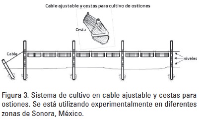 En términos de investigación, actualmente existen proyectos que están atendiendo algunas de las problemáticas derivadas de la actividad ostrícola. Uno de los aspectos en los que se tienen avances importantes, es en la diversificación de tecnologías de cultivo. Investigadores de la UNISON desarrollaron un proyecto, donde probaron experimentalmente el sistema Australiano cable ajustable y cestas para cultivo de ostiones (Fig. 3). Los experimentos se llevaron a cabo en coordinación con productores de diferentes sitios en Sonora y los primeros resultados son alentadores en cuanto a crecimiento y supervivencia (Castro-Longoria et al., 2013). Debido a que este proyecto es de reciente terminación, sólo los productores involucrados en él son los que cuentan con el nuevo sistema. Sin embargo, uno de los inconvenientes es que el cable y las sestas tienen costos elevados, lo que hace suponer dificultades para su implementación generalizada entre los productores.