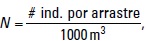 n= Número de individuos 1000 m3 en cada arrastre, Π * r2 * d = Volumen de agua filtrada en cada arrastre, r = Radio de la red, d = distancia recorrida durante cada arrastre; en el caso de los arrastres oblicuos d = l * cos (tan - 1 * tan p) = profundidad máxima del lance; coseno y tangente referidas al ángulo del cable, l = longitud máxima (m) del cable filado y tan p = tangente promedio del ángulo del cable, medido cada 30 segundos (Smith & Richardson, 1979).