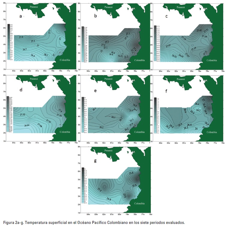 La temperatura superficial promedio en 2001a fue de 27.1°C, con el máximo 29.7°C al noreste (estación 1) y el mínimo 26.0 °C al suroeste (estación 97). En 2001b el promedio fue de 27.2 °C, con un máximo 27.6 °C hacia el sureste (estación 14) y un mínimo 26.3 °C hacia el sur (estación 65). En 2002 el rango fue de 26.4 °C (estación 7, noreste) a 27.8 °C (estación 113, suroeste) (promedio 27.2 °C). 2003, tuvo un máximo de 28.6 °C (estación 3), un mínimo de 26.7 (estación 81) y un promedio de 27.5 °C. En 2004 el promedio descendió a 26.3 °C, con el máximo (28 °C) igualmente hacia el noreste (estación 3) y el mínimo (24.4 °C) en la estación 29. En 2005 el promedio fue de 26.6 °C (rango: 25.4 °C estación 49 - 27.7 °C estación 1). En 2007 se registró el valor medio más bajo (25.6 °C); al igual que en los periodos anteriores, el valor más alto (28 °C) ocurrió en el noreste (estación 3) y el mínimo (24.2°C) en las estaciones 81 y 111. En términos generales, las aguas costeras del noreste se caracterizaron por ser más cálidas y de mayor extensión, mientras que las del suroeste fueron más frías (Fig. 2).
