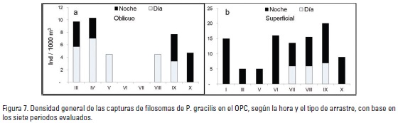 Los arrastres oblicuos (2005 y 2007) capturaron larvas en menos estaciones, con densidad menor que los arrastres superficiales. De igual manera, se destacó la captura de cinco estadios; a diferencia de los ocho capturados durante los arrastres superficiales (Fig. 7).