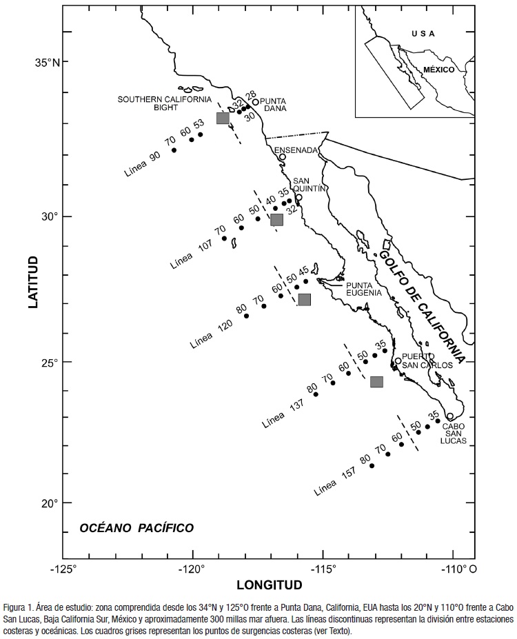 El área de estudio comprende la región nororiental del Océano Pacífico frente a la Península de Baja California (Fig.1). Se utilizó la red de estaciones del programa CalCOFI-IMECOCAL (www.calcofi.org; http://imecocal.cicese.mx/) y en particular las estaciones hidrográficas de las Líneas 90, 107, 120, 137 y 157. Las posiciones de las estaciones analizadas se agruparon en costeras y oceánicas, de acuerdo al criterio de Lynn y Simpson (1987) (Fig. 1).