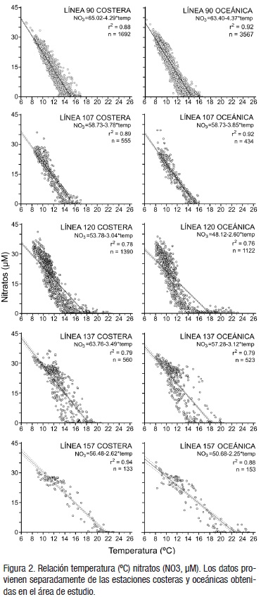 Relación Temperatura-Nitratos. La relación entre la temperatura y nitratos de las cinco líneas de estudio (Fig. 2) se utilizaron con el fin de estimar la concentración de nutrientes en cada zona. Existe una correspondencia directa entre las dos variables en la columna de agua, tanto para las estaciones costeras como las oceánicas. Sin embargo, la relación temperatura-nitratos no fue la misma por región, ya que el intercepto se fue ampliando a medida que la latitud disminuyó representadas por las líneas costeras y las oceánicas, lo que implica que a temperatura de 22 °C aún hay nitratos pero en menor concentración. El intercepto del eje de la temperatura aumentó hacia el sur como se muestra en la Línea 90, donde corta en 15.0 y 14.5 °C en las estaciones costera y oceánica, respectivamente; en la Línea 107 a 16.0 y 15.5 °C; en la Línea 120 a 17.7 y 18.0 °C; en la Línea 137 a 18.4 y 18.2 °C y en la Línea 157 a 21.6 y 22.5 °C. Los coeficientes de determinación de las relaciones lineales explican entre el 80 y 90% de la varianza total.