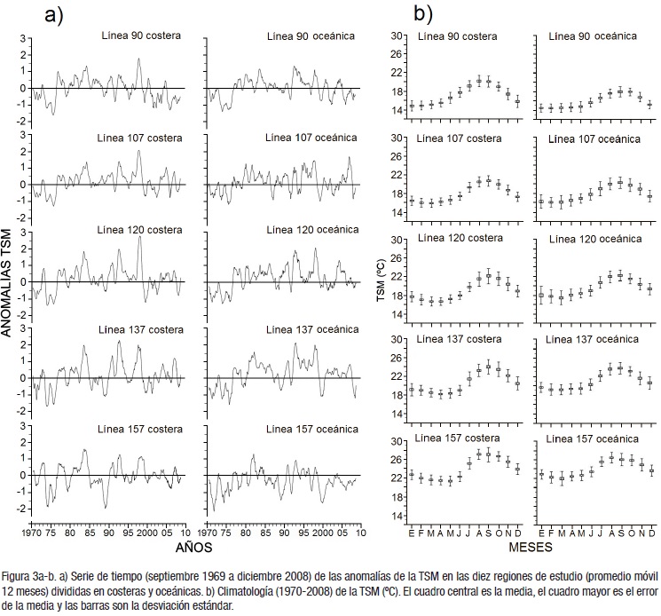 Anomalías de Temperatura. El área de estudio se caracterizó por anomalías negativas en los primeros años de la década de los setentas. Un período de anomalías positivas de aproximadamente 22 años (entre 1977 y 1998) se presentó en las estaciones costeras y oceánicas de las líneas más norteñas. Se muestra igualmente, un intervalo de anomalías negativas a partir de 1999, pero menos pronunciado que en los años setenta (Fig. 3a). Los máximos de anomalías de temperatura en las estaciones oceánicas fueron menores que las costeras. Las anomalías de mayor amplitud se concentraron en la zona de la Línea 120 costeras, disminuyendo hacia el norte y hacia el sur. La Línea 107 oceánica presentó los valores más altos en el último periodo de anomalías negativas de temperatura. La Línea 157 oceánica presentó valores negativos durante más tiempo que el resto de las líneas. En general, la señal de anomalías negativas entre 1985 y 1989 fue más intensa al sur y disminuyó hacia el norte. De acuerdo con esta tendencia, el régimen frío en la región frente a Baja California terminó aproximadamente entre 1976 y 1977, originando un cambio hacia anomalías positivas de la TSM. Los valores extremos de anomalías positivas se presentaron en los años 1982-84, 1992-93 y 1997-98, con mayor impacto en las áreas costeras debido al predominio de eventos "El Niño". Durante este período largo de anomalías positivas se registraron algunos años con anomalías negativas, como lo fueron 1985, 1989 y 1995, relacionadas principalmente con la presencia de eventos hidrometeorológicos fuertes en la región, originados por cambios bruscos en el gradiente de presiones atmosféricas por la presencia de eventos "La Niña". En la climatología de TSM, los valores máximos ocurren entre agosto y octubre, mientras que los mínimos entre enero y abril. La Línea 90 oceánica mostró el valor mínimo de 14.48 °C y el máximo de 18.09 °C. La estación oceánica de la Línea 157 mostró la temperatura mínima más alta de la región (21.62 °C), mientras que la posición costera tuvo la temperatura máxima de 27.09 °C (Fig. 3b). En general, se presentó una diferencia latitudinal de 13.41 °C entre Punta Dana, California y Cabo San Lucas, Baja California Sur (Fig. 1 y 3b).