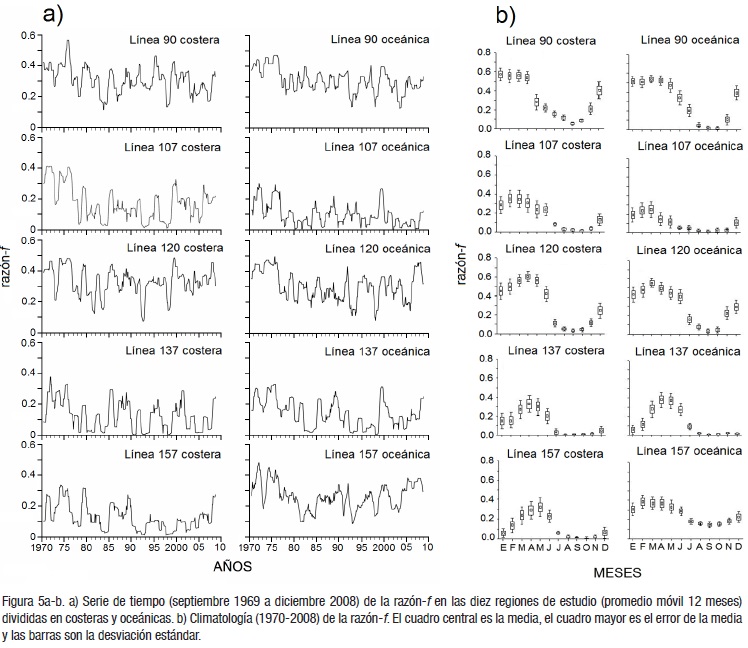 Razón-f. Las estaciones de la Línea 90 presentaron valores altos de f en toda la serie, seguida de la 120 y 157 oceánica. Los valores altos de f se presentaron en los primeros años de los 70s; sin embargo, es marcado el descenso hasta 1984 (Fig. 5a). La razón-f se recuperó en casi todas las estaciones a partir de 1994. La climatología de la razón-f (1970-2008) en general presenta valores altos en la época fría (meses DEFMAM) y bajos en la época cálida (JJASON). Los valores medios de razón-f se incrementaron con la latitud durante la época fría. De la Línea 120 oceánica hacia el norte y hacia el sur los valores decayeron en la época fría. El norte, centro y sur del área de estudio presentaron valores altos de razón-f para el área oceánica (Fig. 5b).