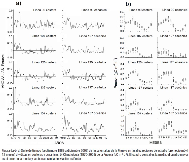 Anomalías de Pnueva. La serie de Pnueva presentó valores de anomalías positivas en los primeros años de la década de los setenta, con una ligera inflexión hacia valores negativos durante el evento cálido de 1972-1973 (Fig. 6a). En 1975 se observaron anomalías positivas en las estaciones oceánicas y en las costeras. Las anomalías presentaron valores negativos a partir del evento cálido de 1976-1977, las que continuaron debido a eventos similares durante 1982-1984 y 1986-1988. En 1979-1980 las anomalías presentaron signos positivos en las estaciones costeras, no así en las oceánicas. La serie muestra una disminución de las anomalías positivas hacia el norte en 1985 y 1989 en las costeras, mientras que las oceánicas no presentaron valores positivos (Fig. 6a). Sólo la Línea 157 oceánica mostró un ligero incremento en las anomalías. Una señal positiva se manifestó desde 1990 hasta el primer semestre de 1992, con la disminución durante el evento cálido (1992-1993 y 1994). La señal positiva de 1995 se reflejó con intensidad sólo en las localidades costeras de las Líneas 90 y 107. El evento cálido de 1997-1998 afectó la región de estudio, inclusive con los valores más bajos de anomalías negativas. A mediados de 1998 comenzó el incremento en las anomalías de Pnueva, continuó durante el evento frío de 1999-2000 principalmente en las oceánicas de sur a norte y disminuyó en las costeras de las Líneas 120 a la 90. No se presentaron anomalías positivas en la Línea 157 costera desde 1989. Un evento cálido de bajas proporciones (El Niño-débil) afectó toda la zona, con una disminución ligera de los valores de Pnueva durante 2002-2003. Después de este último evento, la zona recuperó la producción nueva con anomalías positivas a causa de la presencia de eventos fríos en la región sur de la CC que han afectado la mayoría de las estaciones, excepto la más sureña de la Línea 157. Para la climatología de la Pnueva (1970-2008) la primavera es la época de mayor producción nueva, aunque en algunas temporadas se adelantaron en marzo y otros se retrasaron a junio, como las oceánicas de las Líneas 107 y 120, respectivamente (Fig. 6b). En mayo se presentaron los valores medios mayores de la Línea 120 y abril en las costeras de las Líneas 90 y 107. Diciembre presentó valores altos de Pnueva en las Líneas 90, 120 y 157, mientras que los de las líneas intermedias como la 107 y 137 fueron bajos. El valor medio más alto se observó en la estación oceánica de la Línea 90, mientras que el más bajo en la 107 oceánica (Fig. 6b). Destacan los valores bajos en otoño. Las áreas consideradas con muy baja producción nueva en la época otoñal son las estaciones costeras de las Líneas 107, 137 y 157, así como la 137 oceánica (Fig. 6b). La Tabla 1 muestra los estadígrafos de la climatología (valores medios, desviación estándar y error) de la Pnueva.