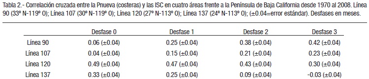 Relación Pnueva-Índice de Surgencias Costeras (Pnueva-ISC). En abril se presentó el máximo de Pnueva (0.25 ± 0.02, gC m-2 d-1) para la Línea 90 costera (Fig. 7b), asociada con un valor de ISC de aproximadamente 200 m3/s/100m (Fig. 7a) para el mismo mes. Sin embargo, mayo y junio presentaron máximos de ISC en el intervalo entre 275 y 300 m3/s/100 m, lo que corresponde a una Pnueva baja. La Línea 107 costera presenta niveles de ISC cercanos a 200 m3/s/100 m en abril, mayo y junio (Fig. 7c), coincidiendo con los tres meses de máxima Pnueva (0.160.17 ± 0.03, gC m-2 d-1) para la misma estación costera (Fig. 7d). Las estaciones costeras de las Líneas 120 y 137 mostraron una variación similar en los primeros seis meses, tanto del ISC (Fig. 7e, g) como de Pnueva (Fig. 7 f, h): el primero presentó valores por debajo de 200 m3/s/100m, mientras que el segundo 0.25 (±0.03) gC m-2 d-1 y 0.18 (±0.03) gC m-2 d-1, respectivamente. El análisis de correlación cruzada entre Pnueva y el ISC en las cuatro líneas de estudio mostró que las estaciones costeras de las Líneas 120 y 137 indican máxima productividad sin desfase en meses con respecto al ISC, mientras que las Líneas 90 y 107 presentan desfase de tres meses con respecto del máximo de Pnueva (Tabla 2).