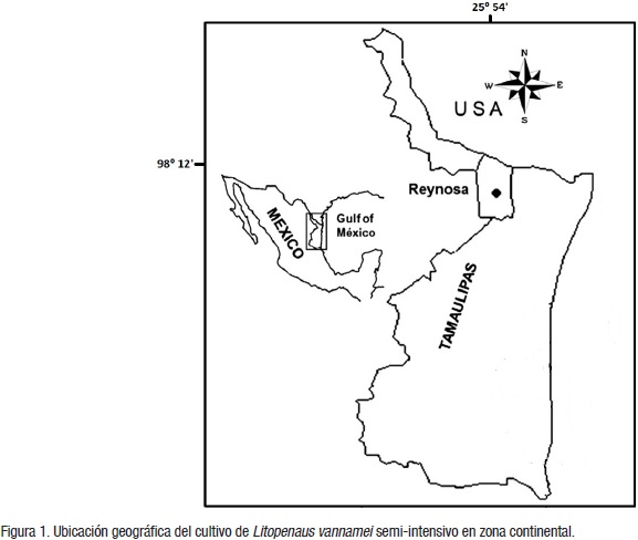 Este estudio se realizó en el 2008 en una granja camaronera con tres estanques de tierra de forma rectangular de 30.000m2 cada uno, localizada en la zona conurbada de la ciudad de Reynosa, Tamaulipas, México, (25°54'33.2' N - 98°12'39.9' O; GPS modelo 12XL Garmin, KS, USA, Fig. 1).