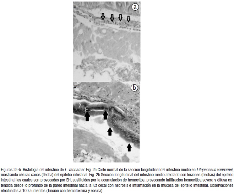 Los resultados histopatológicos de EH obtenidos en este trabajo concuerdan con los reportes de Brock et al. (1995) y Lightner et al. (1996) quienes describen el cuadro clínico de la EH con inflamación del epitelio intestinal y proliferación hemocítica en la parte media del intestino y sólo en camarones sub-adultos y adultos, con similitud a lo reportado en langostas (Homarus americanus Milne-Edwards, 1837) adultas inoculadas en laboratorio (Battison et al., 2008). En el presente estudio, la EH se observó en sub-adultos de L. vannamei, presentando lesiones a lo largo del intestino medio, con epitelio necrótico con múltiples capas de hemocitos (Fig. 2b).