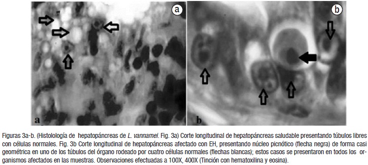 Por otra parte, Lightner et al. (1996), también manifiesta que la EH puede afectar el hepatopáncreas por la contaminación del agua del estanque con el fungicida agrícola llamado Benomyl®, causando hipertrofia nuclear en los túbulos hepatopancreáticos y nucleos picnóticos de forma casi geométrica, lo cual concuerda con los resultados observados y por lo cual consideramos que esta podría haber sido la causa de la EH presente en los camarones analizados en este estudio (Fig. 3b) al concordar completamente con el cuadro clínico descrito por Lightner et al. (1996).