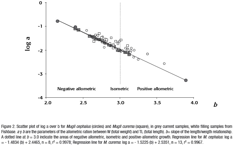 In order to provide a more species-specific overall relationship, data from all locations were plotted in Figure 2. It is evident that every decrease in the slope of the regression line will lead to an increase in the intercept, and vice-versa. Most of the results show negative allometric or isometric values with exception of San Antonio Bay (b = 3.87 for M. cephalus, Fig. 2 symbols in grey). Values from the Fishbase (Fig. 2 symbols in white) data depict similar performance with mixed results with current data from this study and between species. When comparing parameters of the plot of log a over b no differences were found between species (p = 0.134).