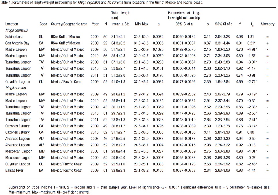to determine whether the slope b differ between years from the same location. For M. curema information from one-way ANOVA was used to determine whether locations differ. For M. cephalus comparisons were done by Kruskal-Wallis analysis since homoscedasticity was not achieved.
