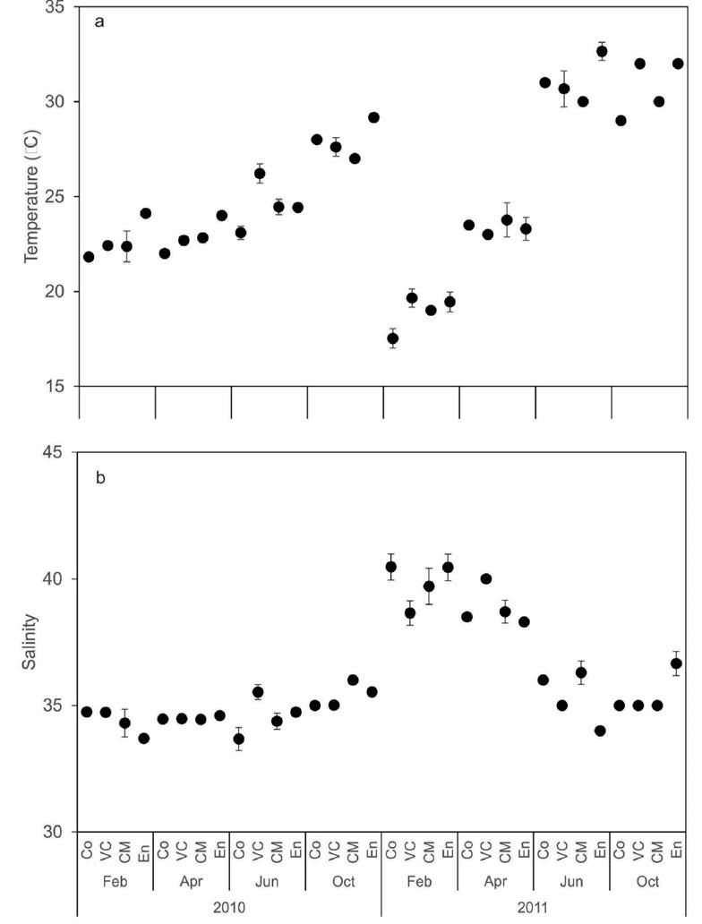 Temperature showed significant differences during the sampling period with the lowest temperature at Co during February 2011 (17.5° C) and the highest at En during June 2011 (32.7° C), an annual pattern could be observed (Fig. 2a). Salinity showed little variation, but significant higher values (p < 0.05) were recorded during February (38.5 to 40.5) and April (38.5 to 40.0) at the four sites during 2011 (Fig. 2b).