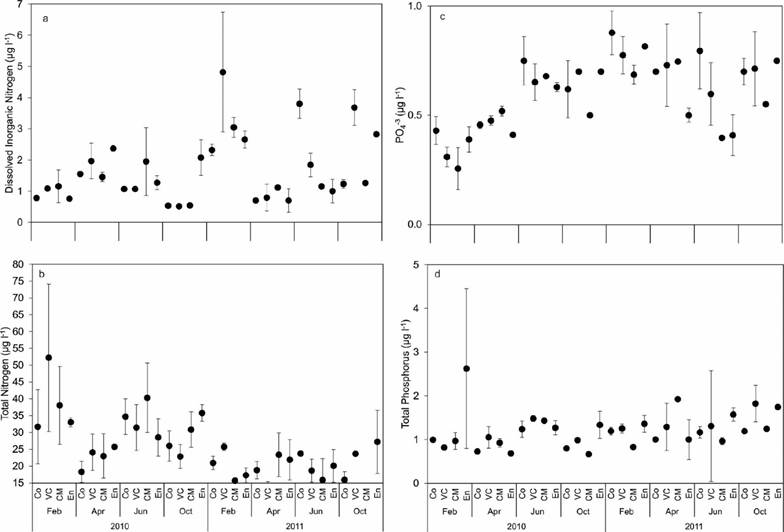 Nutrient concentrations were variable along the study period, between years, months, and sites. For the DIN significant differences were found (p < 0.05), the highest DIN was recorded during 2011 at sites VC and Co during June, no clear seasonal pattern could be observed (4.2, 3.8 and 3.6 µM l-1; respectively; Fig. 3a). Total nitrogen concentrations between years, months, and sites, were also variable but with no significant differences; however, the highest concentration was observed during 2010 at VC during February (52.4 µM l-1, Fig. 3b). For the PO4-3 no clear seasonal patterns could be observed (Fig. 3c). The TP concentrations were variable but were very low, only during 2010 the highest concentration was observed at En in February (2.8 µM l-1); however, no clear seasonal patterns could be observed (Fig. 3d).