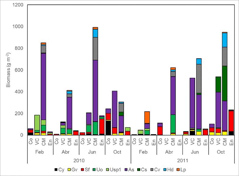 Figure 4 Seasonal variation in the mean biomass of important species at four sites. Co=Conchalito, VC= Vista Coral, CM= Casa del Marino and En=Enfermería. Cy= Cyanoprokaryote, Gv= Gracilaria vermiculophylla, Sf= Spyridia filamentosa, Uo= Ulva ohnoi, Usp1= Ulva sp.1, As= Acanthophora spicifera, Cs= Caulerpa sertularioides, Cv= Caulerpa verticillata, Hd= Halimeda discoidea, Lp= Laurencia pacifica.