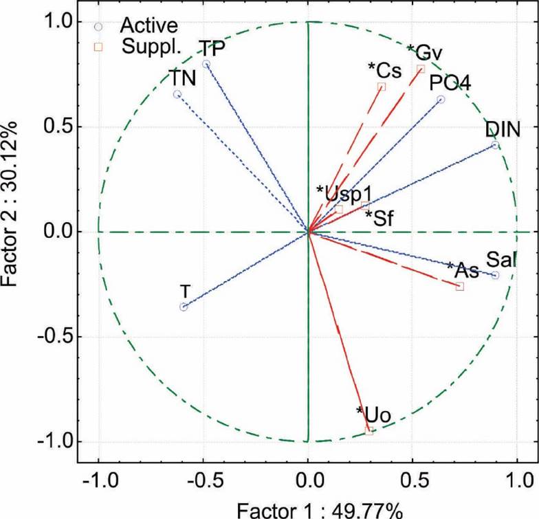 The relationships between environmental parameters and “important” species biomass with the highest presence were analyzed by principal component analysis (PCA) (Sfriso & Marcomini, 1997). The significance criterion for each component was the eigenvalue (1). The greatest absolute values were selected from the correlation matrix. If there were two or more values in the same column, there was a correlation, if the signs were the same there was a direct relation, and if the signs were different there was an inverse correlation (Ballesteros-Grijalva et al., 1996). All analyses were carried out using the program STATISTICA (StatSoft, 2004).