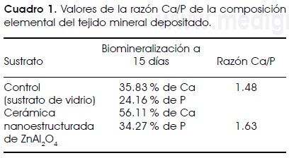 El ensayo de la biomineralización se realizó para determinar el efecto de la nanotopografía de las cerámicas de aluminato de cinc sobre el depósito de tejido mineral. El análisis del tejido mineral depositado por las células osteoblásticas al ser cultivadas sobre las cerámicas nanoestructuradas de ZnAl2O4 y sobre los sustratos control a un tiempo de 15 días por microscopia de fuerza atómica, permitió caracterizar la disposición morfológica que adquiere el tejido mineral. En los cultivos controles la disposición del tejido mineral consiste de una delgada capa homogénea que cubre toda la superficie del sustrato (Figura 4A) sin porosidad aparente, mientras que, en la superficie cerámica se observan crecimientos minerales granulares, aglomeraciones del tipo columnar y zonas tipo laja que asemejan a la morfología del hueso esponjoso (Figura 4B). Asimismo, el análisis elemental del tejido mineral depositado sobre la cerámica de aluminato de cinc, se llevó a cabo por un tiempo de análisis de 600 seg, en tres zonas diferentes y pidiendo al programa de multielementos químicos únicamente la composición elemental de calcio y fósforo para obtener la composición de las zonas homogéneas de los nódulos mineralizados en la superficie de ZnAl2O4. Los resultados mostraron un aumento en la composición elemental que se refleja en una mayor razón de Ca/P debido a que el efecto de la nanotopografía fue aumentar la diferenciación celular y con ello aumentar el depósito de tejido mineralizado cuando se comparan con los cultivos control (Cuadro 1).