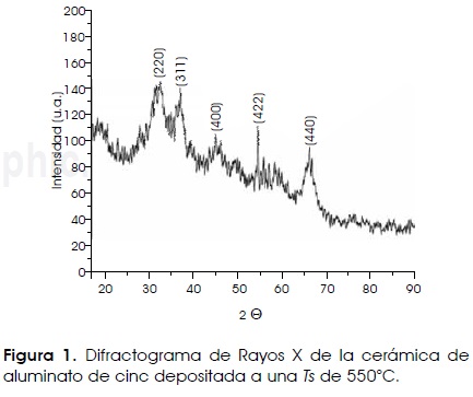 Las películas delgadas depositadas a una temperatura de 550°C por 3 minutos fueron caracterizadas por medio de las técnicas mencionadas anteriormente para determinar sus propiedades cristalinas y de morfología superficial. Los patrones de difracción de rayos X (XRD), muestran picos con anchuras considerables debido a las dimensiones nanométricas de los cristalitos que conforman la cerámica de ZnAl2O4. Aquí es bueno indicar que el ensanchamiento de los picos de difracción es debido a los cristalitos más pequeños en la cerámica.