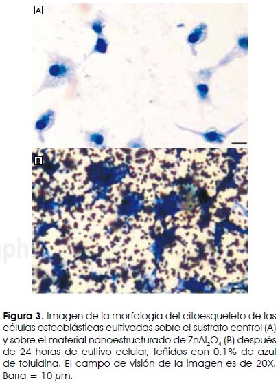 Para establecer el efecto de la nanotopografía de las cerámicas sobre la adhesión celular, los osteoblastos fueron cultivados sobre las cerámicas nanoestructuradas en placas de cultivo de 12 pozos a una densidad celular de 1 x 103 y se cultivaron durante 24 horas; pasado este tiempo, las células que no se adhirieron a las superficies fueron removidas por medio de tres lavados con buffer de fosfatos (PBS), fijadas con 4% de paraformaldehído por 5 minutos e incubadas con 0.1 % de azul de toluidina por 4 horas. Para remover el colorante no específico se realizaron 3 lavados con PBS y posteriormente el colorante fue extraído con 500 vl de dodecilsulfato de sodio (SDS) al 1%. De la solución obtenida se tomaron 100 vl que se colocaron en un pozo de una placa de 96 pozos para obtener su absorbancia a una longitud de onda de 605 nm21. Los valores de la absorbancia obtenidos fueron utilizados para obtener el porcentaje de células adheridas a las cerámicas nanoestructuradas normalizadas contra un sustrato de ZnAl2O4 igualmente procesado con azul de toluidina sin células para restar el valor obtenido de la lectura de absorbancia. Los cultivos controles fueron las células sembradas sobre sustratos de vidrio. Los experimentos de adhesión celular se realizaron por triplicado repitiéndose al menos tres veces.