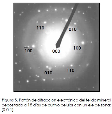 Por otro lado, para determinar si el proceso de biomineralización celular induce un depósito de mineral del tipo amorfo o cristalino, se procedió a hacer un análisis del patrón de difracción electrónica del tejido mineral depositado por medio de microscopia electrónica de transmisión. En la Figura 5, se ilustra el patrón de difracción correspondiente al mineral depositado sobre los sustratos, el cual indica un patrón de puntos y anillos concéntricos. Estos últimos corresponden a la difracción de los cristalitos en el tejido mineral indicando un material policristalino. Los puntos difractan con un eje de zona [0 0 1] que para un material tipo hexagonal genera el conjunto de índices (h, k, l) mostrado en la Figura 5 y que corresponden a las difracciones generadas por un mineral policristalino de hidroxiapatita hexagonal de grano fino. Los puntos extras de difracción se deben a otros cristalitos del mineral de hidroxiapatita de acuerdo a lo reportado en la tarjeta de difracción24: ICCD-09-0432, y al procedimiento de indización rep2ortado por Edington25.