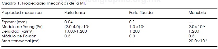 Las propiedades mecánicas17 usadas en este modelo fueron: módulo de Young E = 2.0x107 Pa, en las partes tensa y flácida de la MT y de 2x1010 Pa en el manubrio. El módulo de Poisson fue escogido del mismo valor de 0.3 en cada una de las partes. La densidad para el manubrio y la parte flácida fue de 1,200 kg/m3 y para la parte tensa de 1,000 kg/m3. El espesor seleccionado fue de 0.04 mm y 0.1 mm para las partes tensa y flácida, respectivamente; mientras que el área de la sección transversal del manubrio fue tomada de un valor de 20x 10-9 m2. Para obtener los resultados de la modelación por medio del programa ANSYS se consideró un total de 3,217 elementos entre vigas y placas.