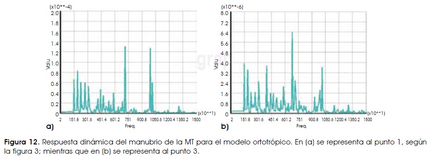 En la Figura 4a, b se muestran los resultados de la modelación en ANSYS (amplitud de la oscilación versus frecuencia) de los dos puntos escogidos en la parte flácida de la MT. En la Figura 4a se grafica el resultado de la modelación del punto 1; mientras que en la Fig. 4b se muestra el resultado del punto 3. Como se muestra en ambas figuras, en éstas existen varios picos de amplitud que indican los valores de frecuencia donde la amplitud de las oscilaciones es máxima.