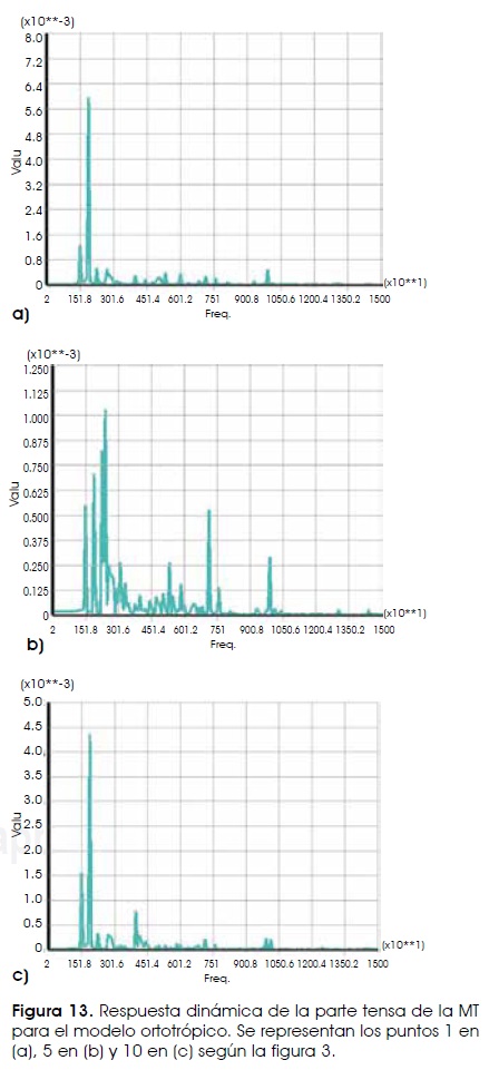 Si comparamos los resultados obtenidos, las gráficas muestran la misma posición para los máximos e igualmente que en el caso anterior la amplitud de estos máximos son diferentes. Recordemos que debido a su disposición geométrica el manubrio mantiene estirada a la MT, es por esta situación que sus desplazamientos son pequeños, lo cual coincide con los resultados obtenidos y están en el orden de 10-4 mm de amplitud de oscilación. La Figura 6 (a-c, b) muestra los gráficos de tres puntos escogidos sobre la parte tensa de la MT. Los puntos escogidos para su presentación fueron 1, 5, 10, según la Figura 3, donde la gráfica de amplitud versus frecuencia para el punto 1 se muestra en (a); mientras que los restantes puntos son mostrados con las gráficas de (b) y (c), respectivamente. Estos puntos fueron escogidos para hacer una comparación con los demás modelos que serán estudiados.