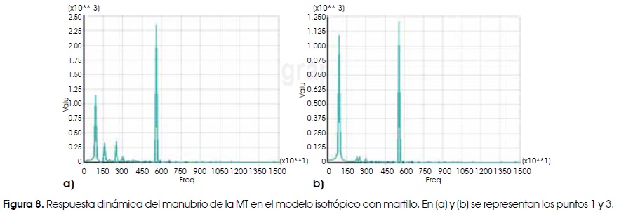 Como se puede observar, en cada figura existen pocos picos de amplitud y el mayor valor fue obtenido para la frecuencia de 5,575 Hz. Por tanto, se puede concluir que la ligadura entre la MT y el martillo influye de manera significativa en la respuesta en frecuencia del modelo. Así la presencia de esta ligadura en el modelo aumenta el valor de los picos de frecuencia, obteniéndose valores por encima de los 5 KHz como en el caso anterior. Por otra parte, en la Figura 8a, b, se muestran los resultados de las modelaciones de los puntos situados sobre el manubrio, en (a) se muestra el análisis del punto 1 (umbo) y en (b) la respuesta en frecuencia del punto 3.