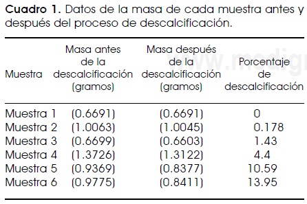 En estas imágenes se puede observar cómo la solución para lograr la descalcificación actúa sobre cada muestra al transcurrir el tiempo. La primera muestra no estuvo inmersa en el proceso de descalcificación, mientras las siguientes muestras duraron un día más que su predecesora en el proceso de descalcificación. Después de este proceso, se calculó la pérdida de calcio (Ca+2) para cada muestra, los cuales están representados en el Cuadro 1.