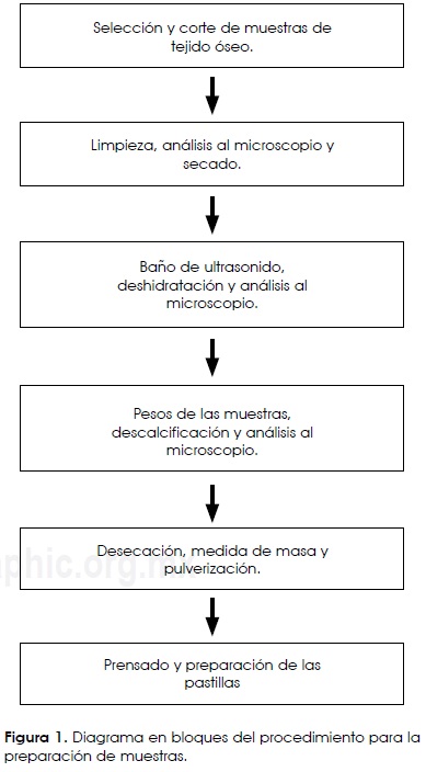 Los huesos están constituidos de diferentes sustancias, tales como: 25% de H2O, 45% de minerales fosfatos y carbonatos de calcio y un 30% de materia orgánica principalmente colágeno y otras proteínas. Para hacer un estudio de la relación existente entre la pérdida de calcio (Ca+2) y las variaciones de FDD en función de la frecuencia es necesario aislar del hueso los diferentes elementos dejando sólo al Ca+2. Este procedimiento es mostrado en el diagrama en bloques de la Figura 1 y está basado en un protocolo patológico, el cual ha sido modificado en orden de profundizar la limpieza.
