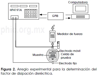 En la Figura 2 se muestra el arreglo experimental utilizado para medir propiedades eléctricas de los huesos. El arreglo está compuesto de una celda de prueba, un analizador de impedancia y una computadora. La celda de prueba consiste en una celda capacitiva de dos electrodos de bronce circulares marca Hipotronics modelo: VPC-234, uno de los cuales puede moverse mediante un tornillo que permite variar la distancia entre las placas del capacitor. Entre estas placas se colocan las muestras (pastillas de hueso anteriormente descritas), las cuales tienen un conocido grado de descalcificación. La placa móvil de la celda permite cerrarse ejerciendo una presión constante, la cual es controlada por medio de un instrumento para medir presión de la firma MECMESIN con intervalo de 0-400 PSI, también mediante un pie de rey se mide la distancia entre las placas. Con estas lecturas se garantiza que se aplique una presión constante sobre cada pastilla durante el estudio y que la distancia entre placas permanezca constante. La celda está blindada ante interferencias de alta frecuencia.