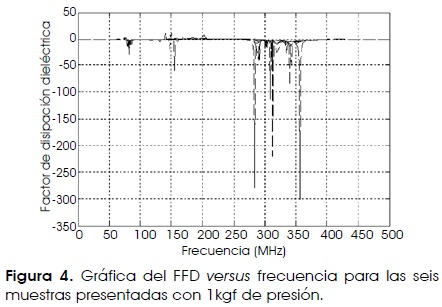 Una vez construida cada pastilla, las mismas son colocadas en la celda de prueba del arreglo experimental descrito. En la Figura 4, se muestran los resultados obtenidos del comportamiento del FDD versus frecuencia para el conjunto de las seis muestras seleccionadas. El estudio se realizó bajo las siguientes condiciones: el analizador de impedancia se mantuvo a un voltaje de 1 v y la frecuencia fue variada en el intervalo de 1 MHz hasta 500 MHz en pasos de 1 MHz; además, la presión entre las placas del capacitor de la celda de prueba se mantuvo al valor de 1 kgf.