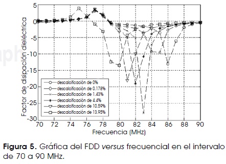 En esta figura se destacan los picos en el valor del FDD que ocurren para diferentes frecuencias en dependencia del grado de descalcificación. Se observa una correspondencia en cuanto a que la posición del pico en el valor del FDD ocurre a menor valor de frecuencia a medida que es mayor porcentaje de descalcificación de la muestra. Por ejemplo, para la muestra con 0% de descalcificación, el valor pico ocurre a la frecuencia de 86 MHz; mientras que para 1.43% de descalcificación el pico ocurrió a 83 MHz. Por el intervalo de frecuencia analizado y considerando a las pastillas de hueso como un material cerámico, los mecanismos de polarización predominantes en este estudio son debidos a carga espacial e iónica.17 Esto quiere decir que los iones calcio son los responsables de la variación en el FDD, por lo que a mayores concentraciones de Ca+2 los picos se recorren a menores frecuencias, indicando una mayor pérdida dieléctrica por una mayor concentración de iones.